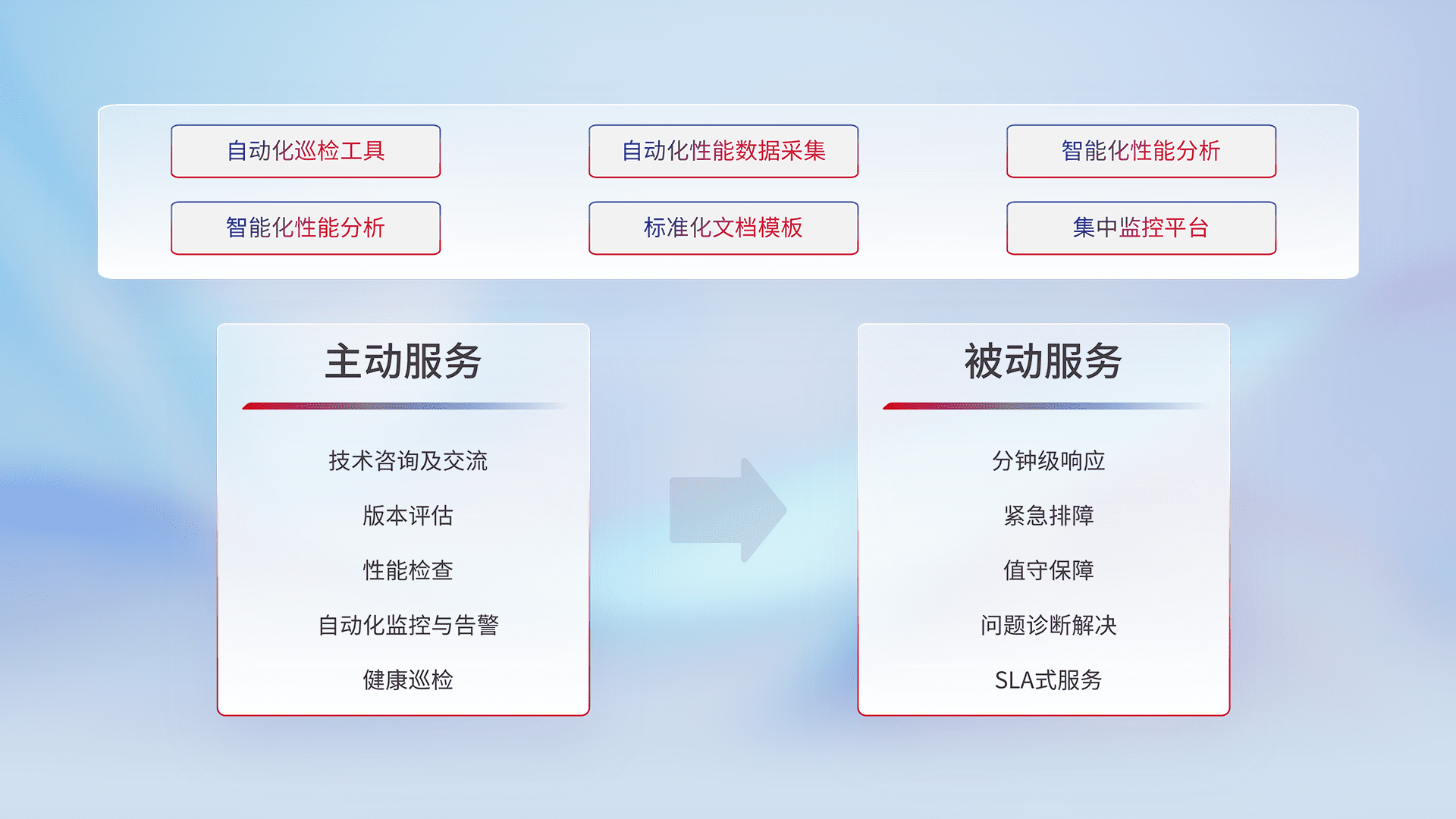 智能化工具和标准化文档,,,,保障服务质量,,,提供主动服务(包含技术咨询、、版本评估、、性能检查、、、自动化监控与告警、、、、健康巡检)和被动服务包含(分钟级响应、、紧急排障、、、、值守保障、、、、问题诊断解决、、SLA服务)。。。。