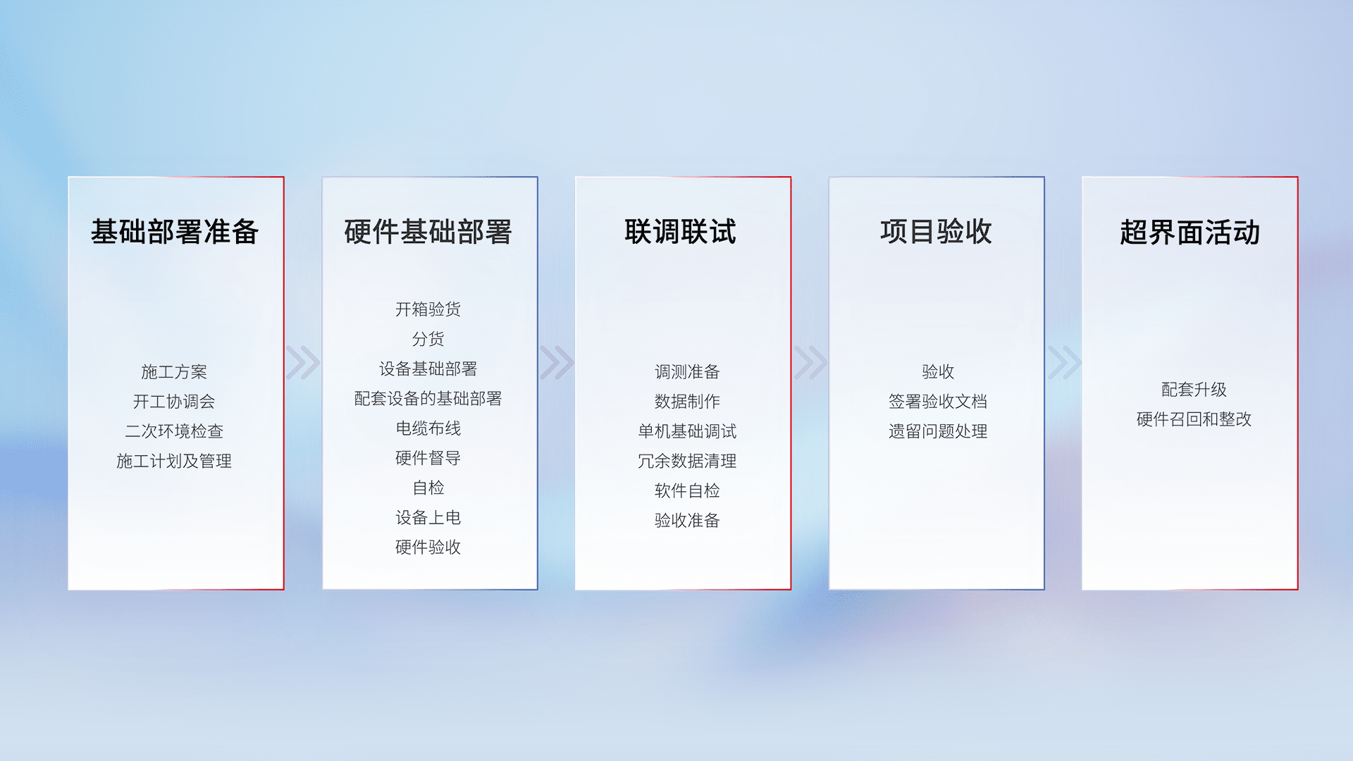 从基础部署准备、、硬件基础部署、、联调联试、、、项目验收、、、越界面活动的全过程可追溯,,,保证施工质量和进度。。
